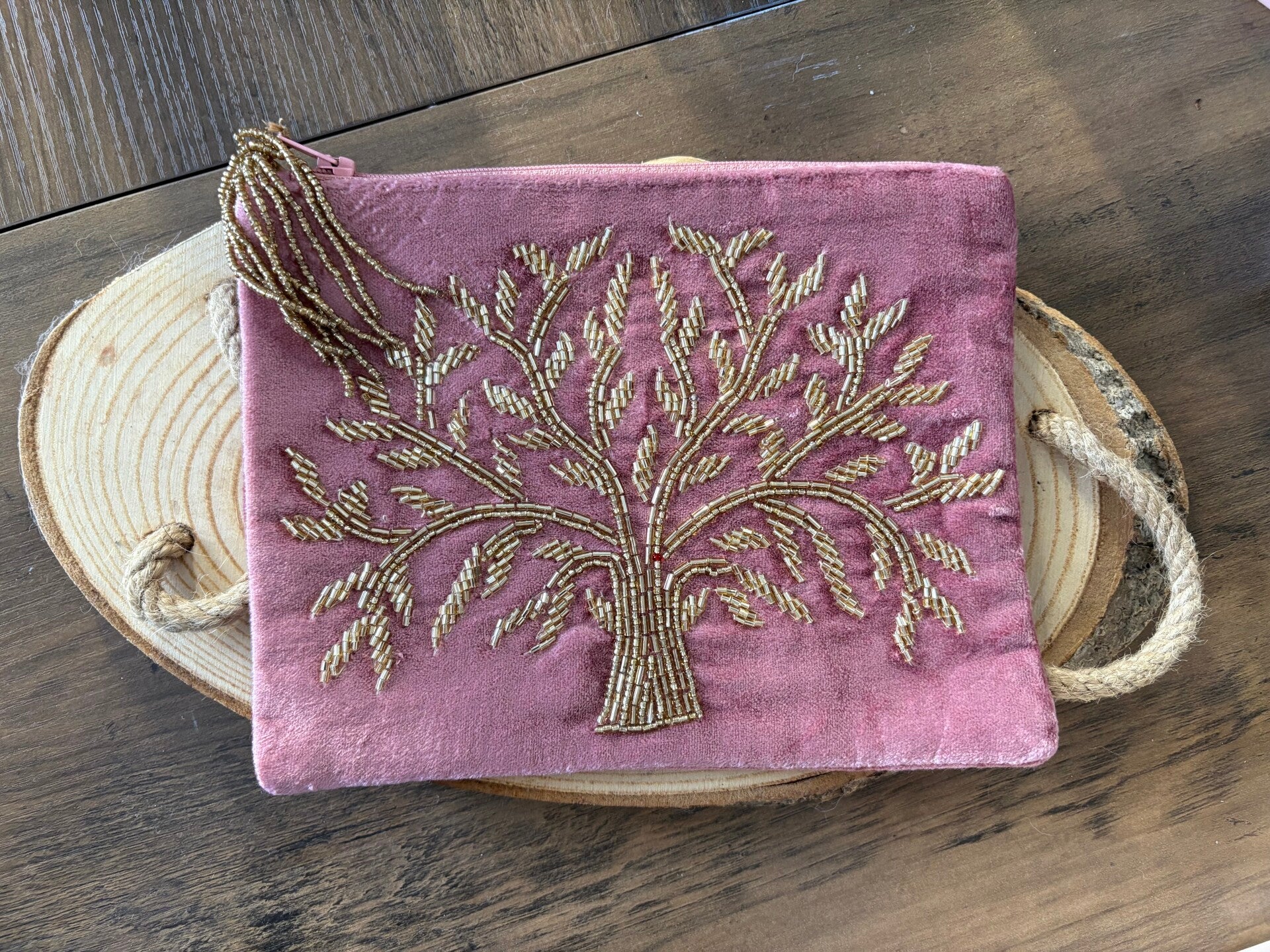 Pochette Arbre de vie en velours Rose poudré.